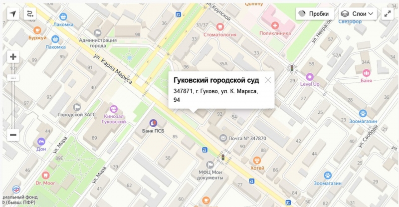 347871, Ростовская обл., г. Гуково, ул. К. Маркса, д. 94Тел.: (86361) 5-22-39, 5-55-47gukovsky.ros@sudrf.ru